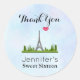 A birthday party thank you sticker with a whimsical drawing of the Eiffel Tower in the background surrounded by green trees. The background is a digital image of light blue watercolors.