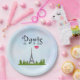 Paper plates with a whimsical drawing of the Eiffel Tower in the background surrounded by green trees. A pink heart and Paris typography add a girlish flair.