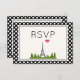 A RSVP card with a whimsical drawing of the Eiffel Tower in the background surrounded by green trees. The background has a nice black and white polka dot pattern.