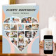 Say Happy Birthday with a love heart photo collage, personalised birthday card with groovy abstract shapes and retro typography. The photo template is set up for you to add your pictures, working in rows from top to bottom. The photo collage holds 18 photos which are displayed in a mix of portrait, landscape and square / instagram formats. Happy Birthday, the name or relation and the wording inside are all fully editable so you can personalise for any one and any occasion. A lovely keepsake card which you can frame or put in a memory box to treasure forever.