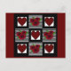 A post card with a quilt style pattern. The design has red hearts on a white background, and red roses on a black and white striped background.