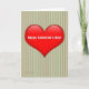 A romantic retro red heart with green stripes blank Valentine's Day card. Card features a large red heart in the centre which reads 'Happy Valentine's Day' on the front, on a green fun retro striped background. This card is blank inside and ready for your special hand written message, or add your message now by simply clicking on 'customise' and select your style, and colour font, and then type in your text to be printed inside of the card. This card is available in our store with a Valentine inner greeting or blank inside. For more retro, flirty, romantic, cute and fun note cards and Valentine's Day cards, postage, and gift items please visit our store!