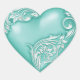 Beautiful heart sticker with silvery white flourish scroll on a turquoise / soft aqua blue green coloured heart, perfect for adorning scrapbook pages or used as an envelope seal.
