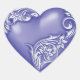 Beautiful heart sticker with silvery white flourish scroll on a lavender blue coloured heart, perfect for adorning scrapbook pages or used as an envelope seal.