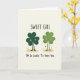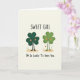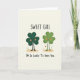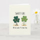 This greeting card features two anthropomorphic shamrocks on a creamy off-white background, set up like a sweet little scene between close friends or a couple 💚. Across the upper half, the words “SWEET GIRL” appear in dark green, hand-drawn lettering that arches slightly above the characters. The left shamrock is a deeper emerald green with a wide, happy smile and rosy cheeks, leaning visually toward the other as if eager to be near. To the right, a lighter green shamrock wears a shy, almost bashful expression with half-closed eyes and a small downturned mouth, its blush suggesting it’s quietly flattered ☘️. Near the base of the lighter shamrock, a single red heart floats like a gentle hint of affection between them. Along the lower portion, the message “I’M So LuCKY To HaVe You” is written in matching dark green, stretching beneath the pair to frame them from below. Soft gradients give both shamrocks a slightly textured look, and the red heart stands out crisply against the pale background.