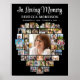 Celebrate your loved one's memory with a collection of photo memories to display at a Celebration of Life, funeral, memorial service, wake or visitation or wall art for your home with this heart-shaped poster print featuring an easy-to-upload photo collage template with 44 pictures in a variety of squares and rectangles to accommodate individual and group photos, your custom title (shown with IN LOVING MEMORY), name and dates in your choice of font styles and colors and background color in EDIT (shown in white on black). OPTIONS: The sample is shown in a 22x28" size; other sizes available (choose Custom Size for even borders by changing the height and width proportionately AFTER clicking the UNLOCK icon). You can also transfer the design to a foam board, banner, tapestry backdrop or other products. ASSISTANCE: For help with design modification or transferring the design to another product, contact the designer BEFORE ORDERING via the Zazzle Chat MESSAGE tab below or email makeitaboutyoustore@gmail.com.