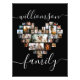 Heart-Shaped Photo Collage Family Script Caligraphy, Create a stunning Photo Enlargement featuring 35 of your most cherished memories! Our heart-shaped photo collage template beautifully showcases your pictures in a mix of portrait, landscape, and square Instagram formats. Simply upload your photos in rows, from top to bottom, and enjoy a design with a sleek black background and the word "family" in elegant script. Want to match your home decor? Click "customise further" or message us for assistance in selecting a different background colour. This Photo Enlargement makes the perfect addition to your family photo collection and is a great gift idea for weddings, Graduation, Christmas, Holidays, anniversaries, or engagements.