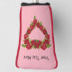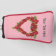 This custom golf club cover for your putters has a heart shaped wreath made of pretty red roses and green leaves on a pink background. Customise your text with the template.
