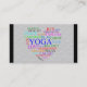 One of a kind business card with inspirational words associated with yoga, arranged in a heart shape.