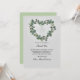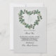 The ivy, eucalyptus and tiny white flower heart wreath, sets on top of a soft grey background. Throughout the floral bouquet is swirls of ribbon with tiny white ribbon hanging down in the middle of the heart wreath. The wording with our heartfelt under than a larger thank you in hand painted script look.