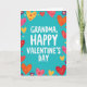 This greeting card centers on the message “GRANDMA, HAPPY VALENTINE’S DAY” in large white letters near the middle. The lettering looks like a friendly sans‑serif style, and it stands out clearly against a bright teal background. Around the words, a border of hearts wraps the design like a frame, with hearts in red, pink, orange, and yellow. Some hearts have little patterns inside, like tiny hearts or speckles, which makes them feel extra thoughtful. Small purple flowers are scattered between the hearts to add a gentle, sweet touch. The overall look feels happy and affectionate, like a warm hug meant just for Grandma 🥰. It’s a meaningful card to give because the message is direct and loving, and the surrounding hearts make the care feel easy to see ❤️. Hope it helps you share Valentine’s Day sentiments in a kind, simple way.