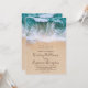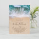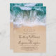 Dreamy beach destination wedding invitation featuring a tropical sandy coastal shore, aqua blue ocean waves, hearts carved in the sand with your initials, and a modern wedding template that is easy to personalise.