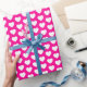 A wrapping paper with white hearts on a hot pink background. You can choose the background colour of your preference.