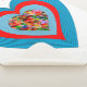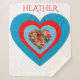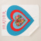 Colourful hearts on a white Sherpa blanket with personalised name.