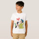 A cheerful and loving T-shirt design featuring a young boy in a green shirt and blue baseball cap hugging his black-and-white dog with a red collar. A large red heart floats above them, symbolising their strong bond. Set against a soft lavender background with playful leaves, dots, and sparkling stars, this heartwarming design is perfect for boys who love dogs and cute, affectionate artwork.