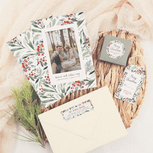 An elegant and minimalist design, with a backdrop of hand-painted holly, watercolor berries, pine, and lush botanical greenery, creates a classic and timeless atmosphere that captures the essence of the season. The design showcases a custom photo of your choice inside a minimal white frame. Below the photo, "heaven and nature sing" is delicately written in script calligraphy, you can change this message to any greeting of your choice. Your family name adds a personal touch, creating a warm and heartfelt message for your loved ones. Cards reverse to the same pattern of holly and pine. This holiday card combines elements of greenery, traditional themes, and minimalist design, a great choice for those who appreciate a traditional yet contemporary approach to holiday greetings. Matching items are available in the collection linked on this page. Message me with any questions - I'll be happy to help. Browse our store for more elegant Christmas photo holiday cards!