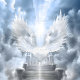 Create a divine tribute with this elegant funeral welcome sign. Featuring majestic angel wings and a heavenly staircase bathed in radiant light, perfect for honoring your loved one's memory.