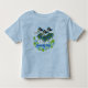 Adorable cartoon of three hula girls dancing surrounded by a floral lei.This design is available in another colorway as well. This original cartoon adorns these toddler t-shirts on the front with a companion print of a cluster of flowers on the back. These designs come in several colorways.