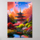 Discover a slice of paradise as a tall Japanese pagoda stands amidst a breathtaking display of stunning flora. The sky above is adorned with pink clouds, casting a serene and dreamy ambiance. Lose yourself in this haven of beauty, where the pagoda and nature harmonise in perfect elegance.