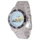 Has heft and feel of expensive stainless steel quartz watches. Good band with safety catch. I removed links, which is easy because engraved arrows show direction to push the linking pins. As always by this seller, the image (a railroad logo) is a perfect reproduction of my emailed image, and is precisely spaced and aligned.