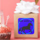 Cute black silohuette of a horse against a royal blue background and encircled in a light blue circle. The words, "Yom Huledet Sameach" (Happy Birthday in Hebrew) match the black silohuette.