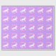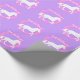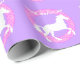 A cute white horse silohouette walks across this purple wrapping paper. The horse is backed by a pink vintage-style circular frame and the words happy birthday in Hebrew across the top of each tile (Yom Huledet Sameach).