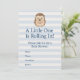A little one is rolling in. Baby hedgehog baby shower invitation on blue strips