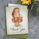 Cheerful baby shower Thank You card design featuring an adorable hedgehog sitting on a whimsical mushroom, holding a bouquet of flowers in a charming watercolor illustration. Background is a beautiful sage green colour.