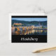 This postcard features a panoramic photograph of the Alte Brucke, Castle and River Neckar in Heidelberg, Baden-Württemberg, Germany, taken at evening time.