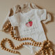 This pink strawberry girl pregnancy announcement baby bodysuit from the Heidi Collection is perfect for a spring or summer baby shower and for baby announcement photos. The unique boho design features cute picnic strawberries in red, pink and white.