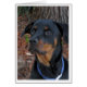 This blank greeting card shows a picture of our beautiful young Rottweiler named Heidi as she poses for the camera near the truck of a redwood tree.