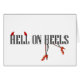 Phrase, “Hell On Heels” in black & white modern cosmopolitan font with red devil horns above the word, “Hell,” and a woman’s legs wearing red high heel shoes underneath the word, “Heels.”