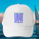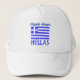 Trucker hat features the Greek flag and the word HELLAS, below in blue. The flag shows blue and white stripes with a blue and white cross in the upper right area. Above it, add a name, in blue, for a personalised touch or create a customised gift. Fun for Greek family reunions, travel groups, and sharing your love and pride in your heritage, ancestry and culture. Great for celebrating Oxi Day, too.