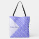 The Greek flag and the word HELLAS below in blue, tiled diagonally for an artistic look.. The flag shows blue and white stripes with a blue and white cross in the upper right area. A white, textured space of squiggly squares holds a spot for your name to personalise this tote bag or create a gift. Fun for travelers. Great for celebrating Oxi Day.