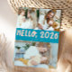 Whimsical and modern New Year's photo template card featuring a typography text that says "Hello, 2026" with 3 of your pictures. You can add another picture and a message on the back of the card. Aqua blue color.