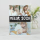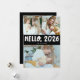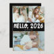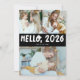 Whimsical and modern New Year's photo template card featuring a typography text that says "Hello, 2026" with 3 of your pictures. You can add another picture and a message on the back of the card. Black color.