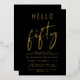 Chic black 40th birthday party invitation featuring "hello fifty" in a blend of a simple font and a stylish script, your name in elegant serif typography and the party details in modern lettering, all rendered in your choice of genuine gold, silver foil or rose gold foil.