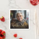 This custom 80th birthday napkin features the guest of honour's personalised photo, name, and birthday, along with the words "hello 80!" in elegant gold-coloured calligraphy script. A dark screen helps make the text pop. A great way to celebrate someone who's turning eighty!