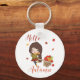 Keychain image features girl with bucket full of apples and pumpkins and some leaves around.
