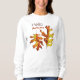 Autumn leaves sweatshirt with an ink and watercolor illustration depicting two brownish yellow pin oak leaves and the text Hello Autumn. One of the leaves has a curled side which looks like a hand it gives to its dancing partner.