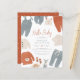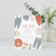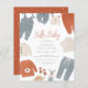 A cute, modern baby shower invitation with "Hello Baby" in terracotta script lettering and your shower details in simple typography. Decorating the edge of this design, there are boho baby clothes in a neutral pastel blue, cream, and rust orange colour scheme. The clothes include overalls, a romper, pants, a beanie, baby shoes, a shirt, and a sweater. There is also a little wooden dinosaur and a fox toy. Invites reverse to a simple Scandinavian white triangle pattern against an orange background. This wardrobe has everything, so this invitation is perfect for spring, summer, fall, and winter babies! "As part of the budget selection on Zazzle, this sheet isn't a standard invite size or paper quality. If you want this design on an invitation card you can find it in our store or use the Zazzle Make Machine to transfer it onto the product of your choice. Feel free to contact me if you have any questions - I'll be happy to help. Visit our store for more designs!