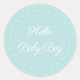 Blue and green "hello baby boy" theme boy baby shower and baby gift stickers white on blue.