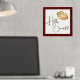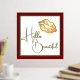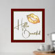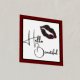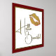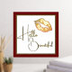 Fashion foil print featuring a golden foil lips set on a white background, with a thin gold foil frame and red matte style frame around the outside. Gold foil text reads Hello Beautiful.