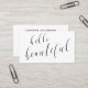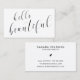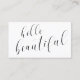 Modern minimalist business card featuring the words, "hello beautiful" in black calligraphy with a heart dotting the "i", over a white background. The back has a heart in the middle and your name and title above and your contact information below.  This design is perfect for a makeup artist, hair salon, lash technician or any business in the beauty industry.