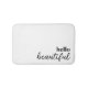 White bathmat with black text "hello beautiful". Great housewarming party home bathroom décor for women.