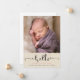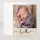 This simple yet elegant birth announcement features the word "hello" in a modern script typography. The bottom portion of the card has a torn paper-like look, while the top displays your new bundles photo. Personalise with baby's birth details. Photography © Storytree Studios, Stanford, CA