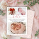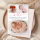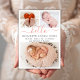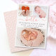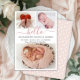 Baby Girl Birth Announcement 3 Photo Collage Cards. Elegant minimalist cute birth announcement featuring 3 of your favourite baby photos on front, with a pretty hand lettered text „hello” in a swirly calligraphy script with swash or tails in blush pink. Add your baby's name on the front and birth stats. At the back side white dots blush pink background. You can easily personalise it.