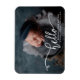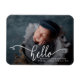 Modern Photo Baby Birth Announcement Magnet. Design featuring hello script, single photo of the baby, birth stats, date and a name on the front.