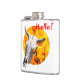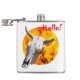 Cow skull against the background of fire and flames. Text - Hello! Customisable hip flask. You can change the image and the text.
