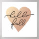 This design features the phrase "hello fall" written in a delicate, flowing script font. The text is centred over a large, soft-coloured heart, which serves as a background element that adds warmth and a touch of charm. The heart is a gradient of autumnal shades, blending from a light golden beige at the top to a deeper, warmer tone at the bottom, reflecting the gentle transition of the fall season. The minimalist yet elegant design exudes a cosy and welcoming vibe.